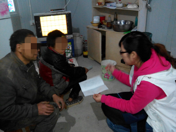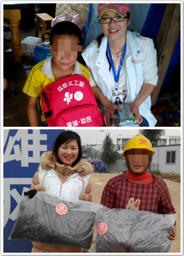 社工为落红左送爱心书包,为其家人送暖和的全新防寒服